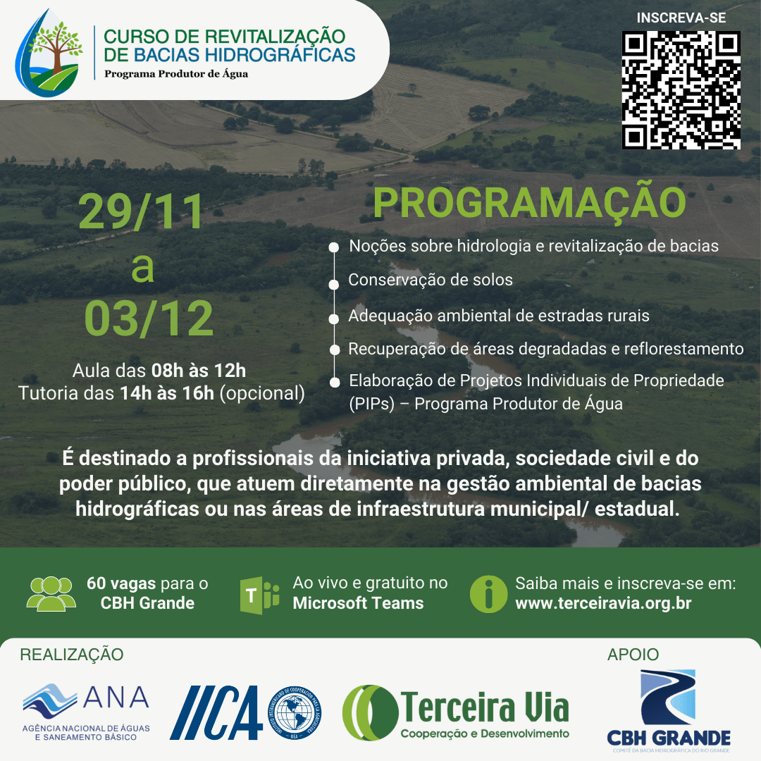 A Associação Terceira Via, em parceria com a Agência Nacional de Águas e Saneamento Básico (ANA) e Instituto Interamericano de Cooperação para Agricultura (IICA), tem o prazer de convidar o Comitê de Bacia Hidrográfica do rio Grande a participar do “Curso de Revitalização de Bacias Hidrográficas – Programa Produtor de Água”.